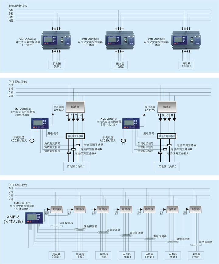 隨著電力系統的迅速發展以及用電安全意識的增強,人們對供電系統的可靠性和安全性要求越來越高。為了更好的保證用電線路的安全,在線實時監控低壓供電系統的智能化綜合保護產品能有效地預防漏電導致的接地、電弧短路等引起的電氣火災,星明電氣公司新研發的XM-380系列產品能有效地對供電線路的電壓、電流、功率、電能、環境溫度等參數進行實時監控,具有多路消防聯動、電網監測、聲光報警、遠程控制等功能,是用電保護系統的配套產品,廣泛應用于高層建筑、公共場所、學校商廈、工廠車間、工礦企業、住宅小區、石油化工、電信及國防等部門的電氣線路保護。