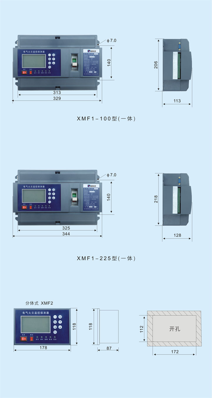 XMF1作為獨立式電氣火災監控探測器,為充分考慮安裝使用的便捷,方便連接進出線導線,而設計了活動安裝面板,在安裝進出導線時,面板可由上撥開,連接完畢扣上即可。注意:選用XMF1-100型時連接導線的接線端子最大寬度15mm,選用XMF1-225型時連接導線的接線端子最大寬度18mm。設備采用4只M6螺釘固定安裝。