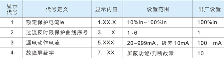 設定功能:額定保護電流le、過流曲線代碼、漏電動作電流、故障屏蔽模式控制字可設。