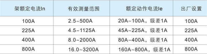 額定動作電流值可在上表中"額定保護電流le設置范圍"內任意設置。