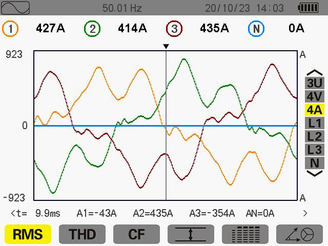 此次測量在其 ABC 電流分別為 427A 414A 435A 當天生產使用其變壓器為60%,未滿負載運行中。